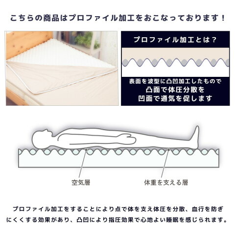 波型プロファイル加工低反発敷きパッドタグ表記品名:低反発マット/タグ表記構造:一枚もの波型中材:低反発ウレタンフォーム 65ニュートン(日本製)側生地:ポリエステル100%(中国製)●サイズ厚み3cm×幅97cm×長さ195cm●加工生産国 日本●備考この商品は【圧縮梱包】にて発送いたします。