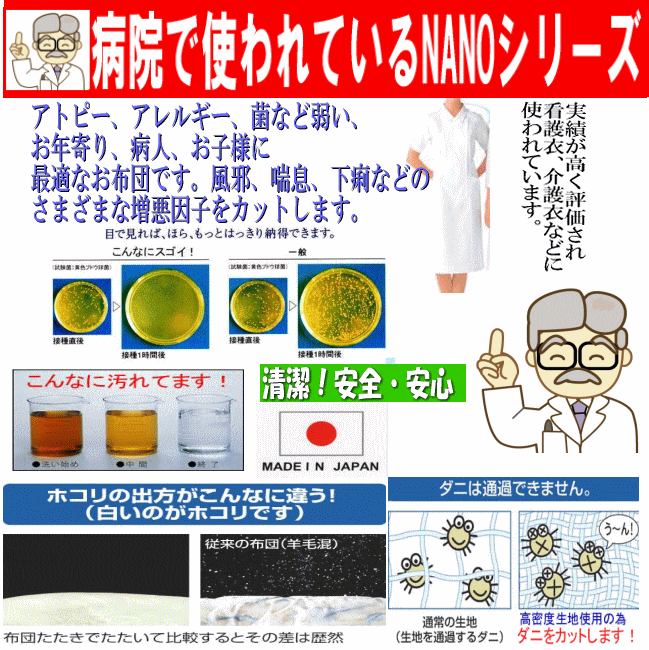 【制菌ドクターEs 布団の特 長(他社との違い)】 ●抗菌からワンランク上のバージョンUPした 高性能の制菌繊維の水洗い可能な中わた使用 病院で使われている制菌を使用 ●病院で使われている布団を 当社寝具技能士が家庭用に改善、 菌にも強くより安全・安心なお布団です。