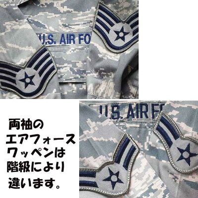 胸と両袖にワッペンが付きますが、両袖のエアフォースワッペンは 階級によりそれぞれ違いますのでご了承下さい。